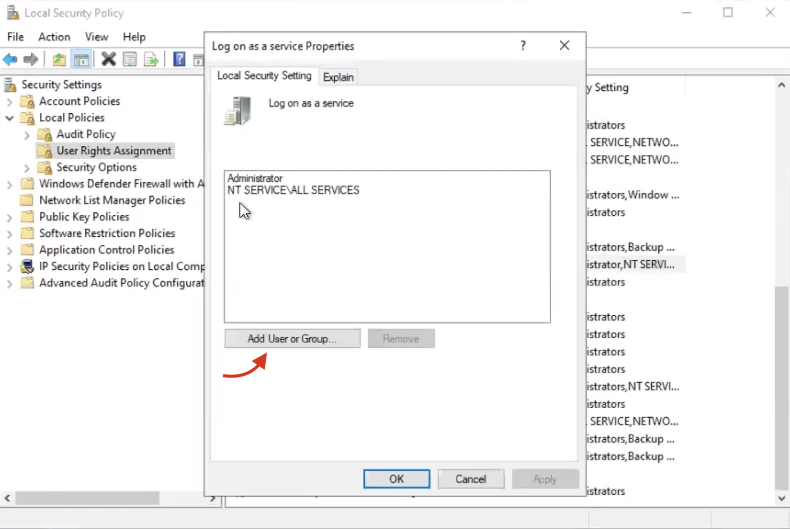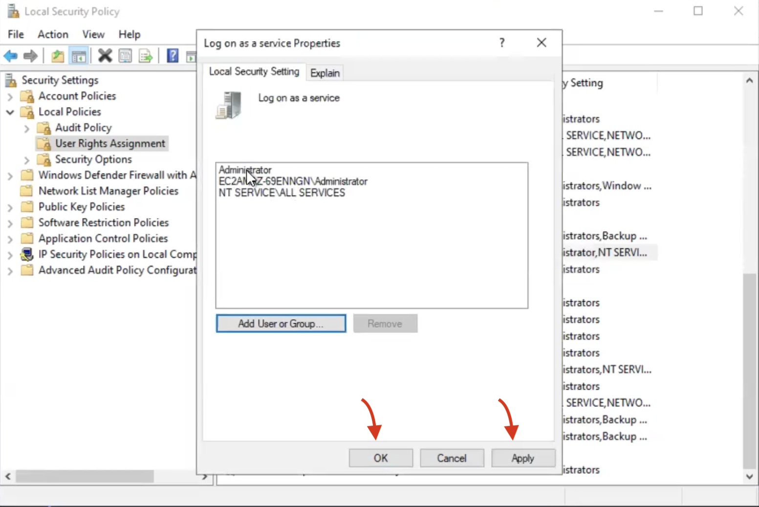 1. Click Apply and OK. This will give you the permissions to log on as a service.