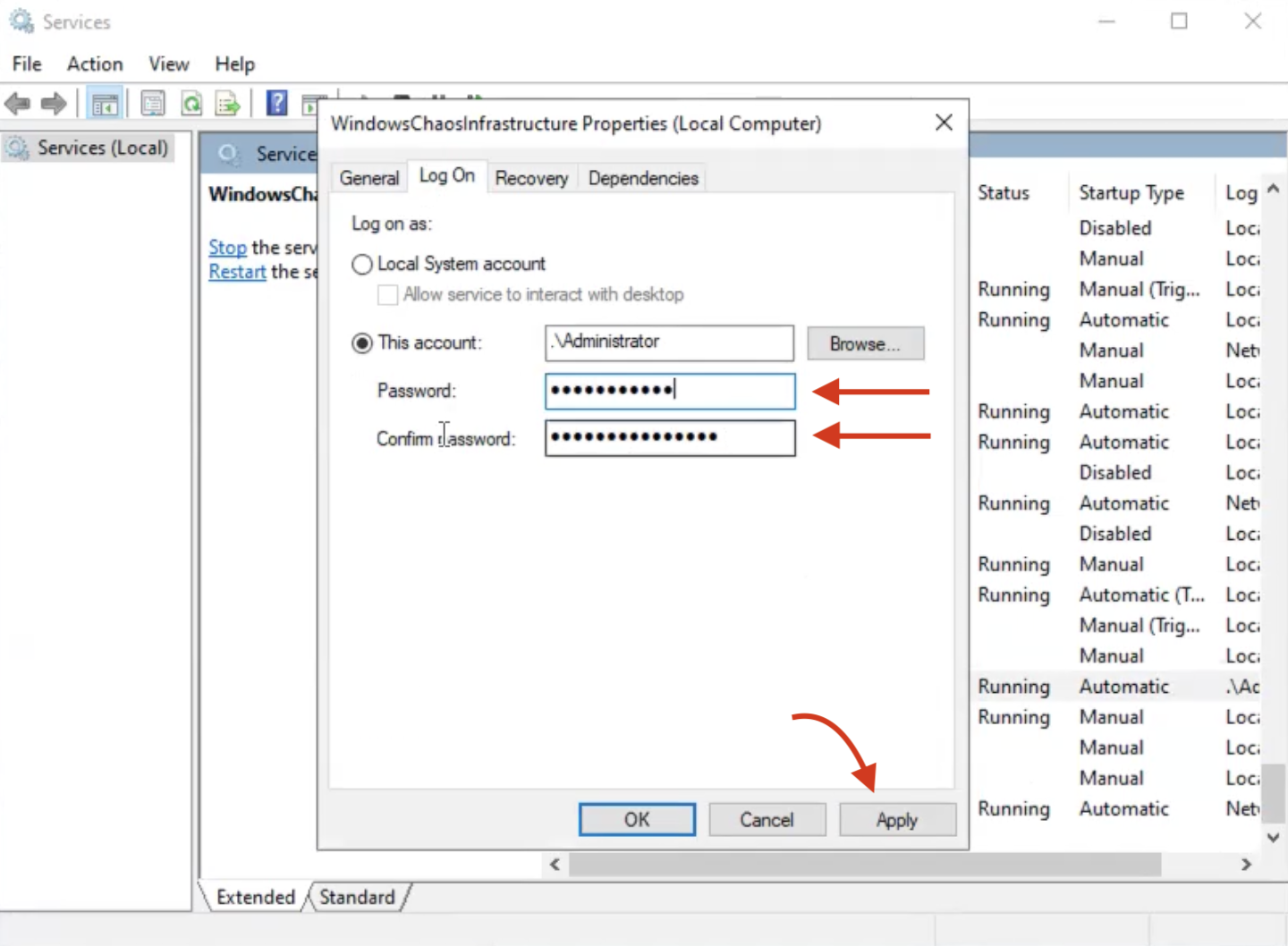 1. The Services tab is opened. Navigate to WindowsChaosInfrastructure. Choose the Log on tab at the top of the window and enter a password and confirm it. Click Apply and Ok.
