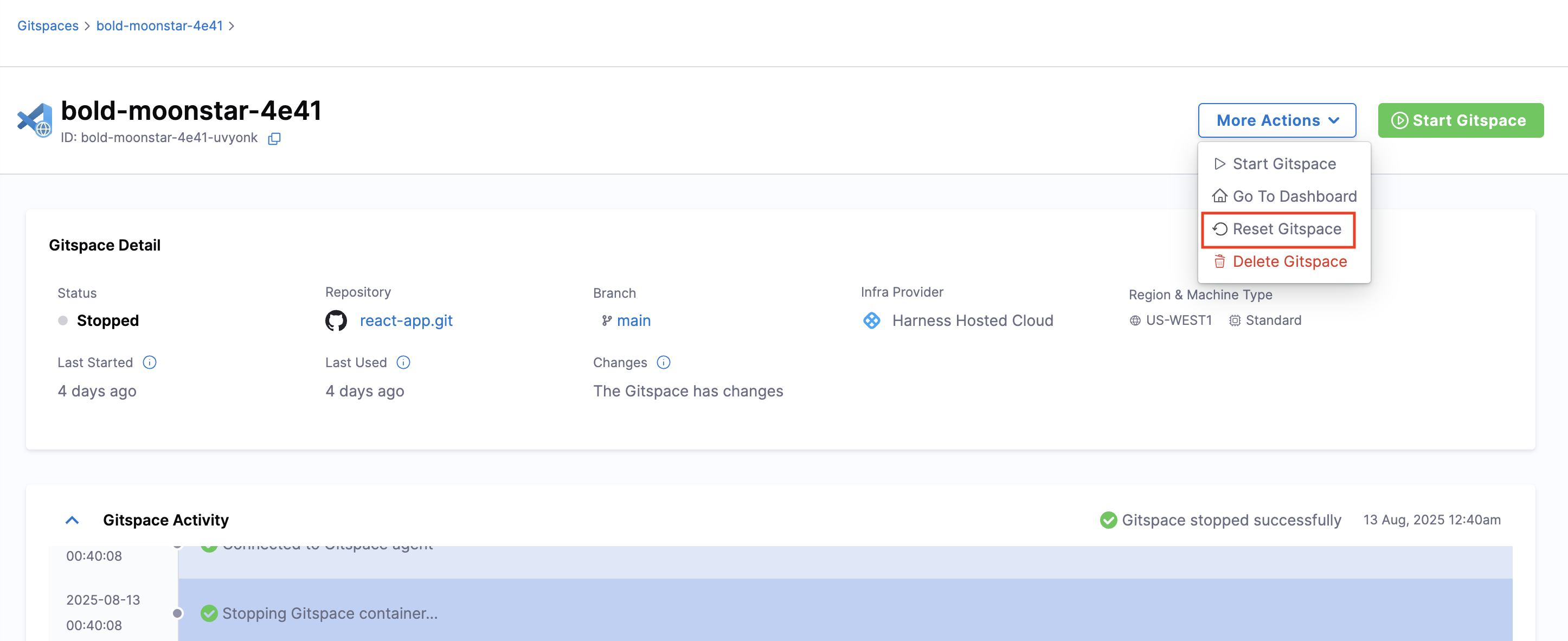 - Select the Gitspace you want to reset and open the Gitspace Details page.