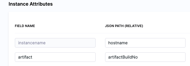 • Instance Attributes: the JSON path to the instance name label for the target instances.Mapping the fieldname instancename to the JSON Path is mandatory.You can add more instance attributes for additional target instance values you want to use.