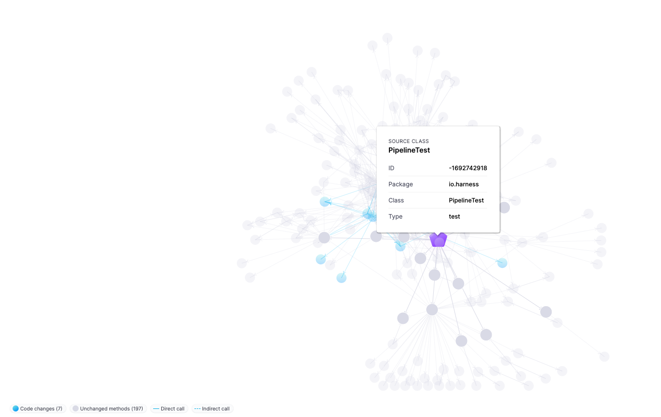 Select Expand graph to view the TI Visualization, which shows why a specific test was selected and the reason behind every test selection. Purple nodes represent tests. Select any test (purple node) to see all the classes and methods covered by that test. Blue nodes represent changes to classes and methods that caused TI to select that test.
