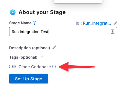2. Enter Run integration test for the Name, disable Clone Codebase, and then select Set Up Stage.
