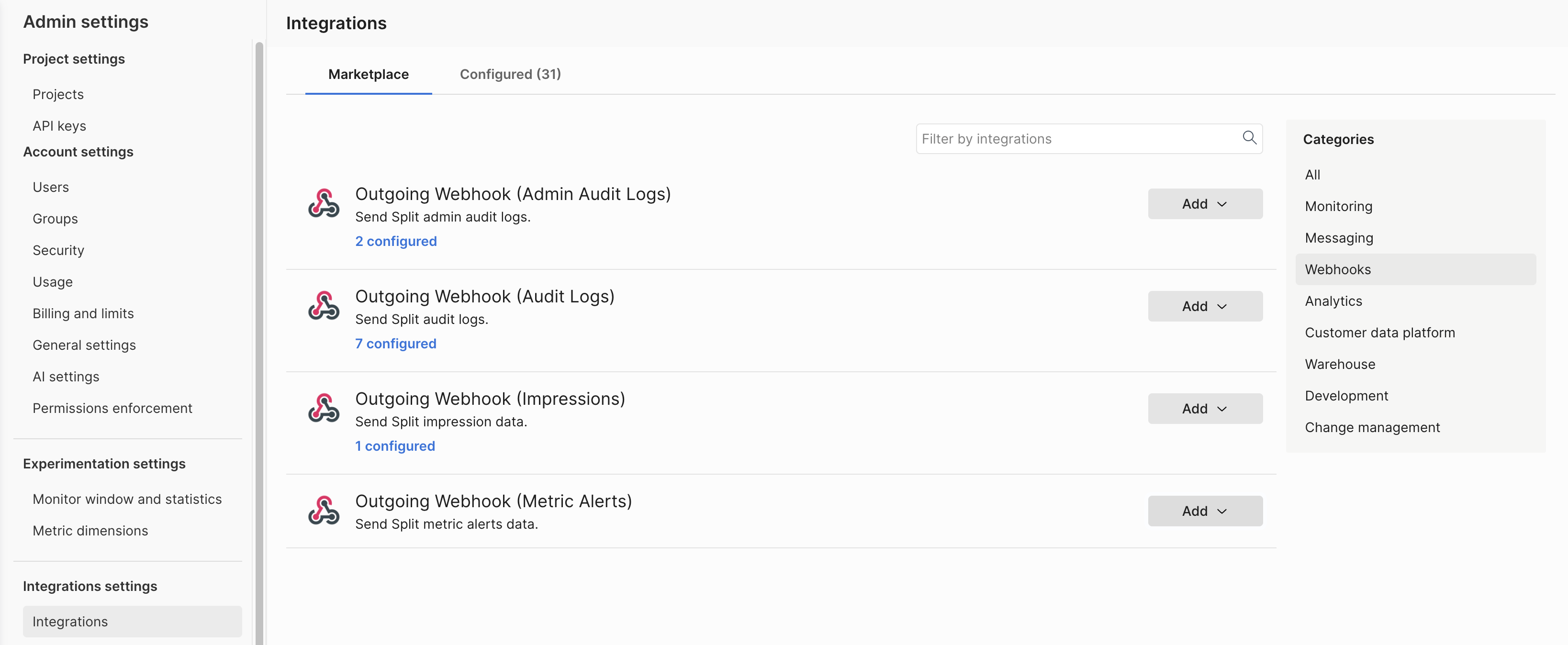 Click Add on the Outgoing Webhook (Metric Alerts) integration and select a project to add the webhook to.