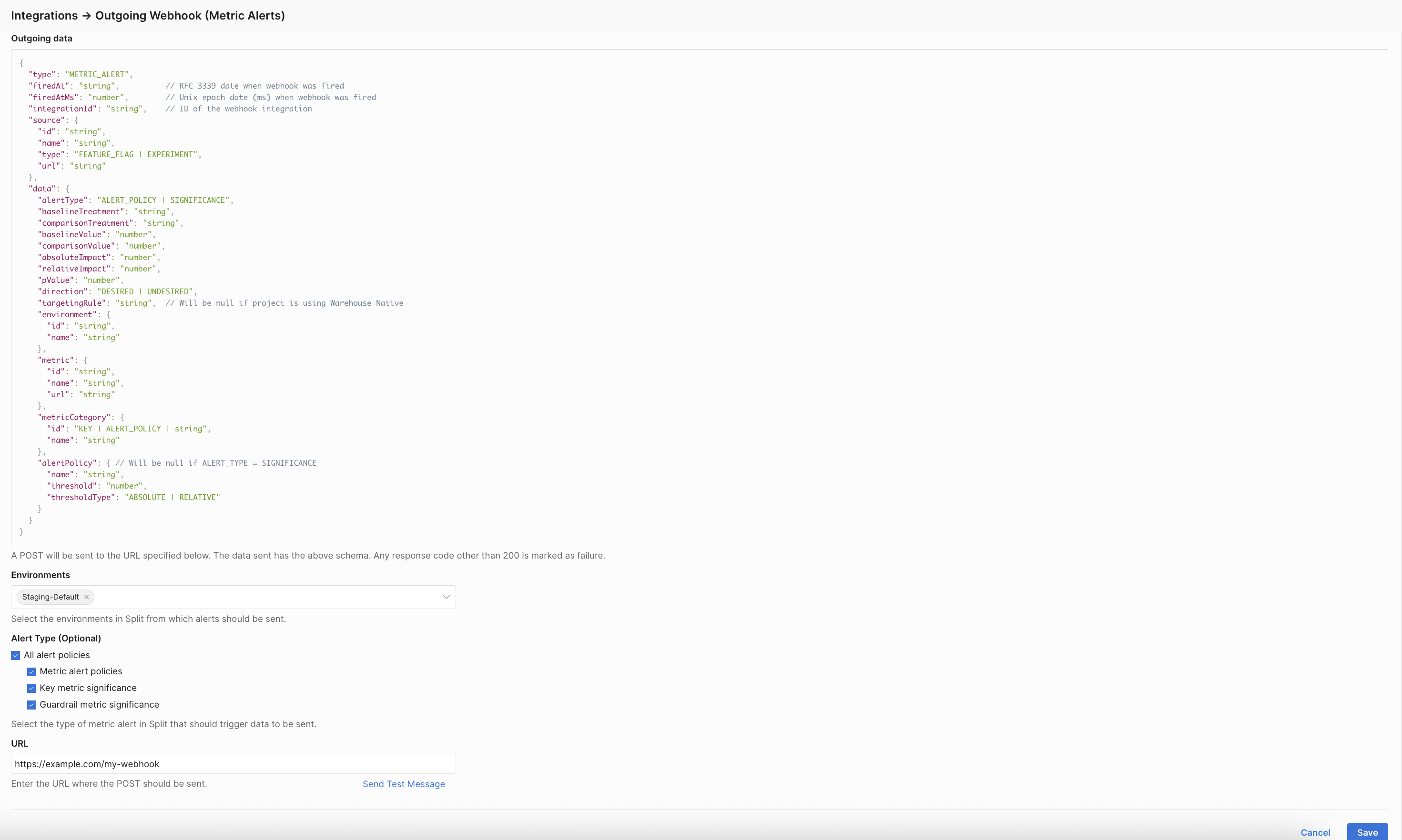 When a metric alert is triggered, Harness FME sends a POST request to the specified webhook URL with the following payload schema: