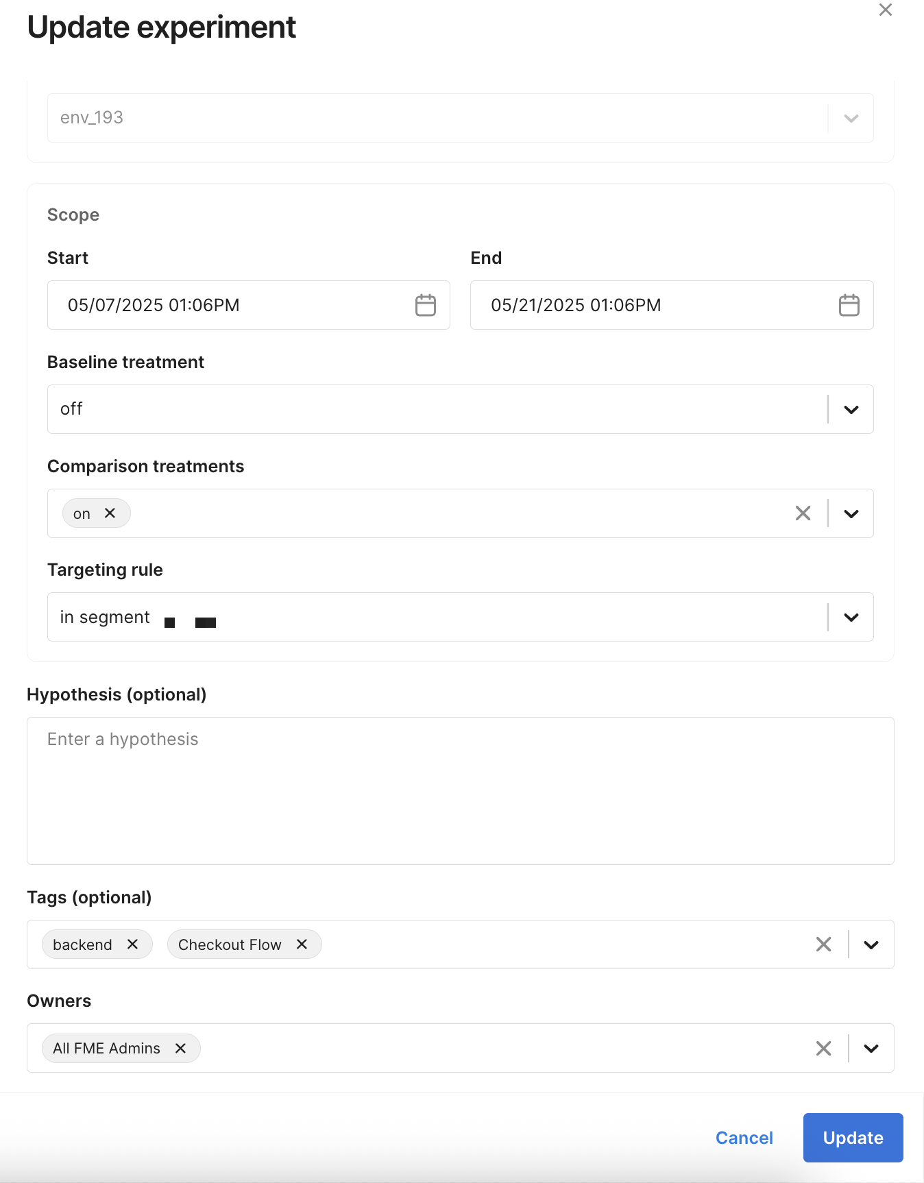 You can add tags to feature flags, segments, metrics, and experiments. Tag names are case sensitive, and tags are shared across projects. The process is similar across all FME objects, but the UI controls differ slightly.