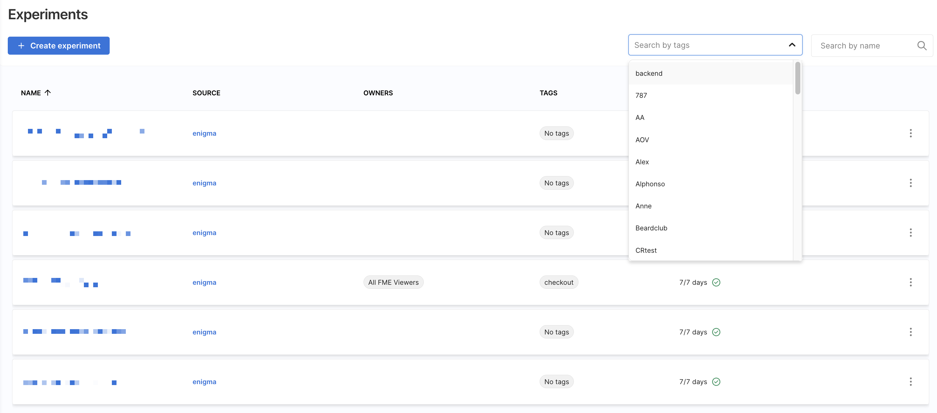 By experiment purpose or scopeGroup experiments related to onboarding, checkout flows, or other test initiatives.onboarding, checkout, retention-test