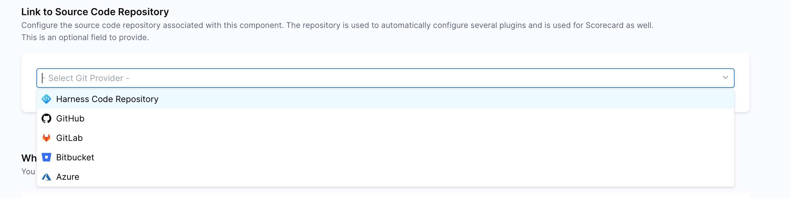 The Link to Source Code Repository feature lets you associate a catalog component with its source code repository directly from the Harness IDP UI. This repository link is used to automatically configure several plugins, fetch repository metadata, and is also used in Scorecards.
