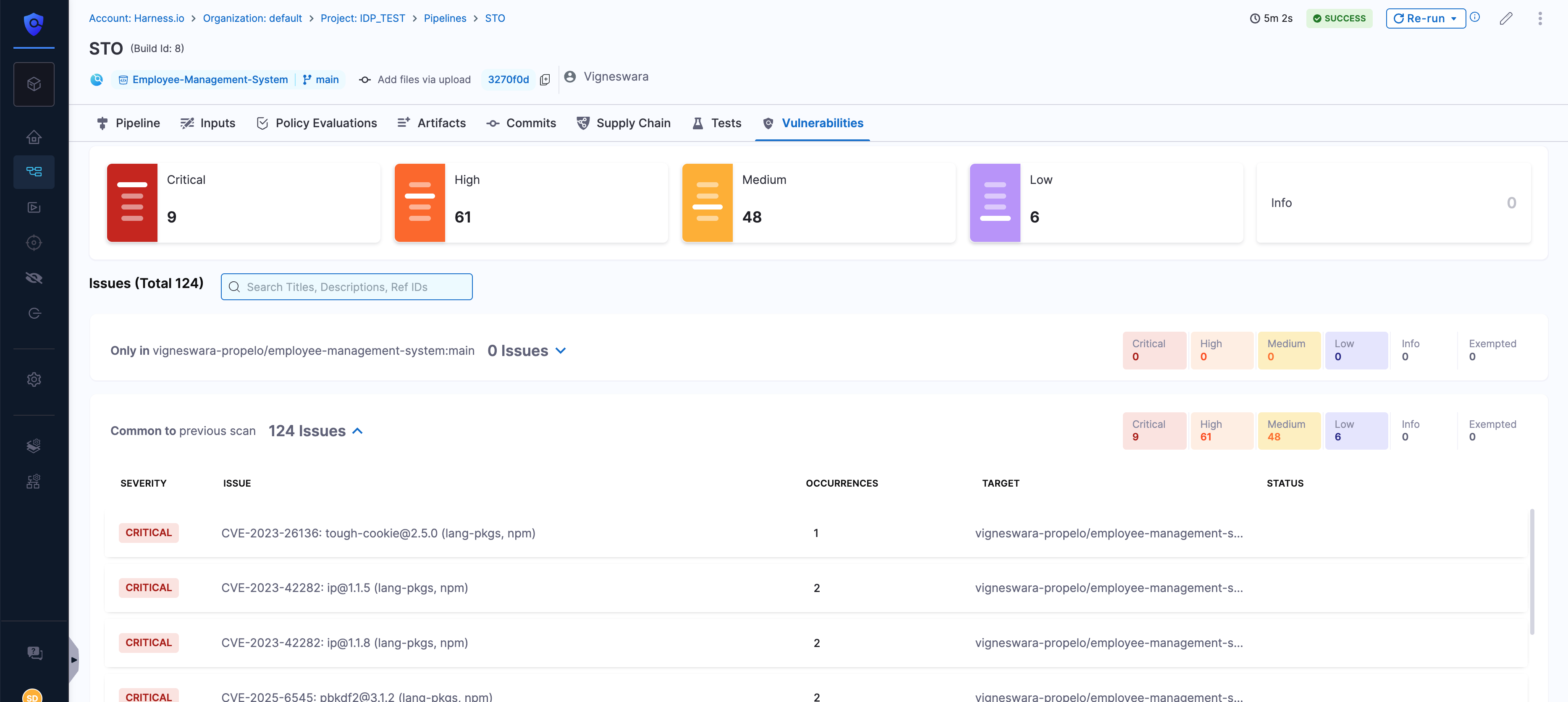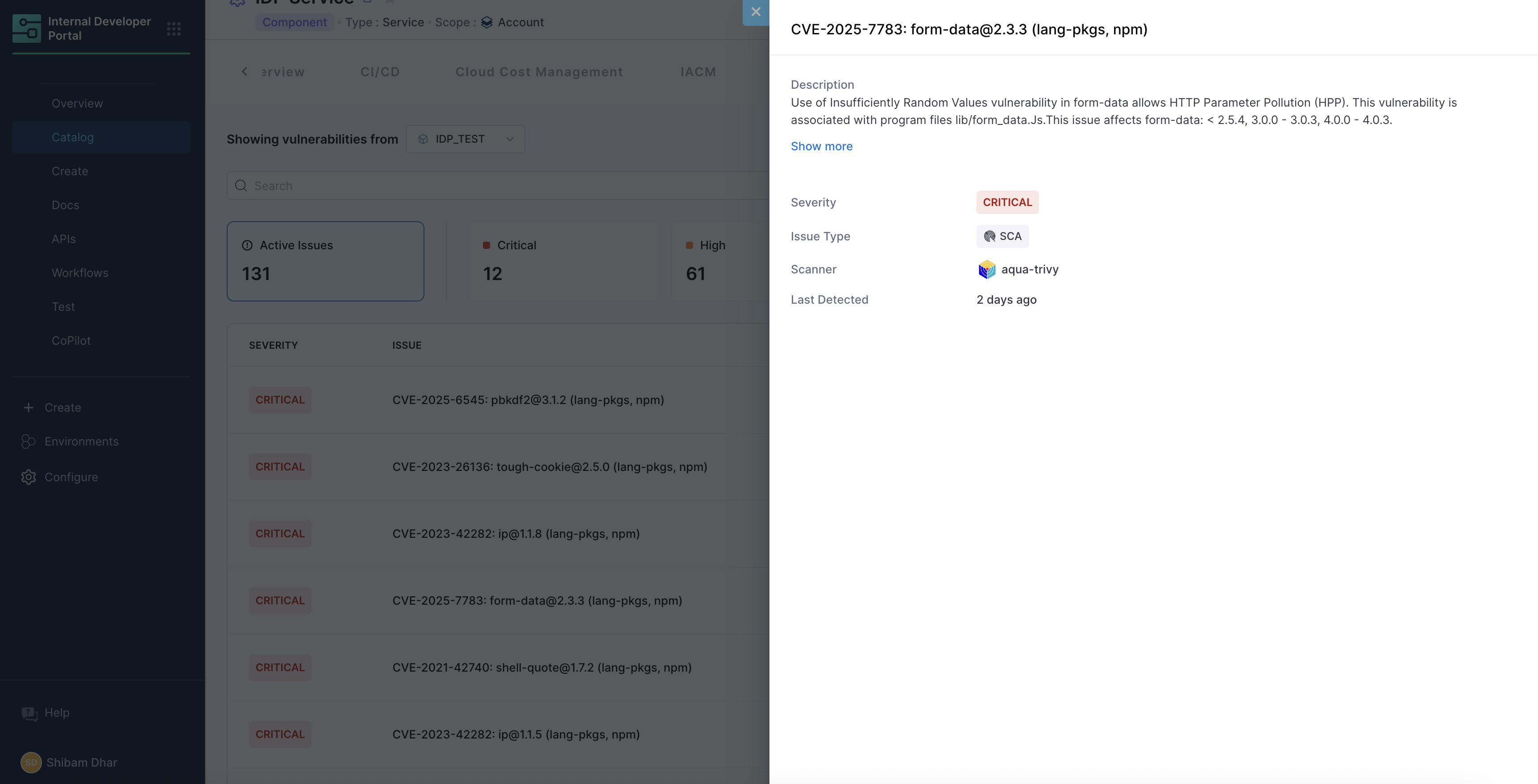 With this integration, vulnerabilities identified by STO scanners are surfaced inside the IDP Software Catalog. Developers can view issues such as CVEs from static or dynamic scans directly alongside their services, projects, and components.