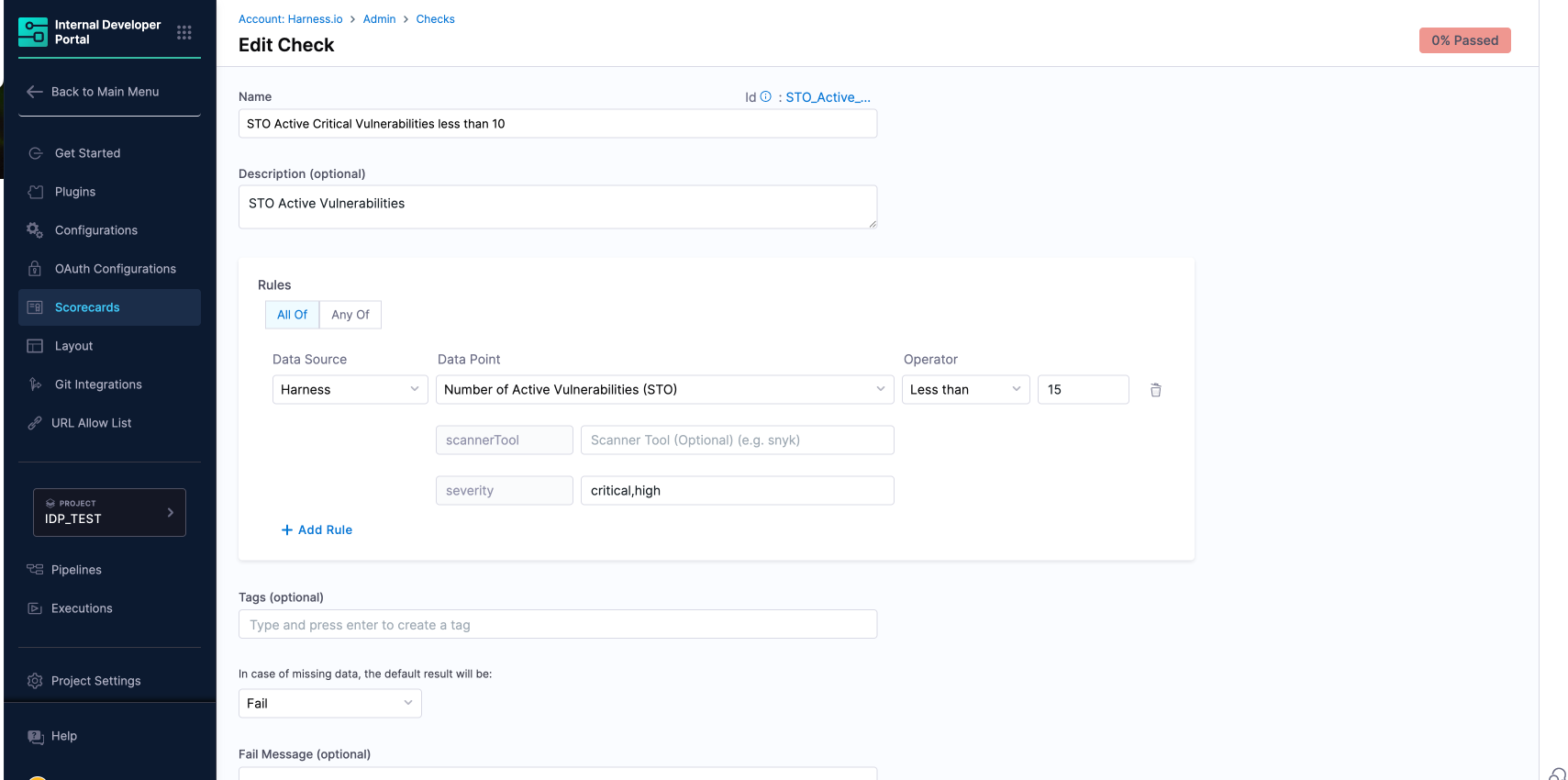 In this section, we will explore how Harness Security Testing Orchestration (STO) integrates with the Internal Developer Portal (IDP) to deliver end-to-end visibility of vulnerabilities — from the moment they're detected in a pipeline, to tracking them over time with scorecards.