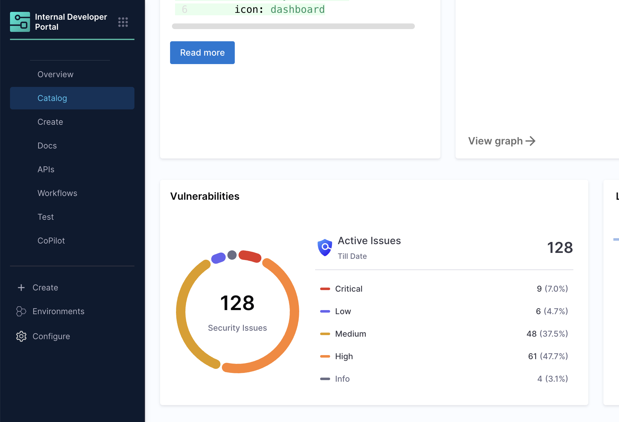 • Security vulnerabilities such as CVEs from static and dynamic scans are surfaced within the IDP Software Catalog, directly alongside services, components, and projects.