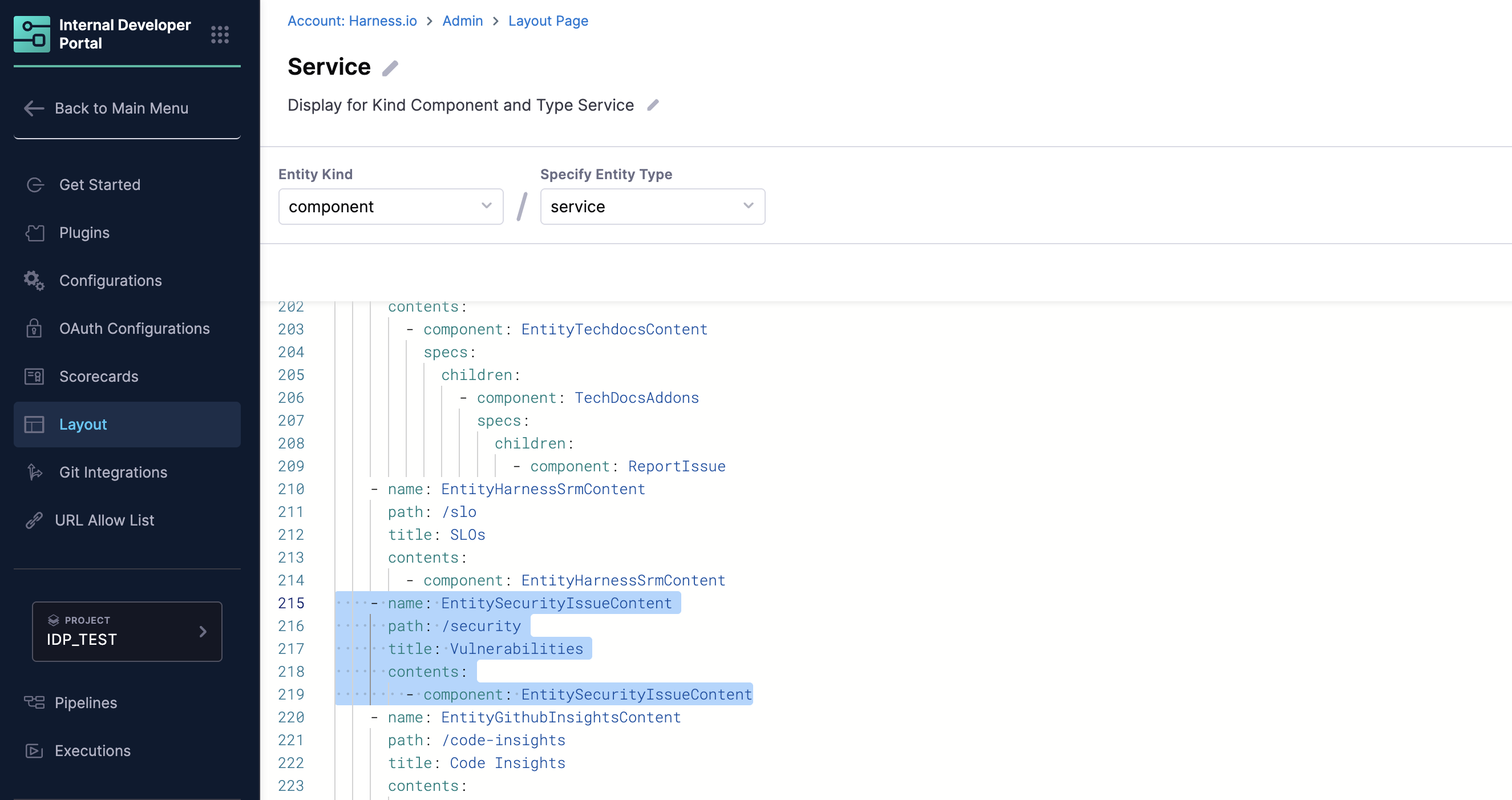 The highlighted section in the image above shows the configuration for the Vulnerabilities tab. Once added, developers will see a dedicated tab for STO security findings directly on each service's entity page, making it easy to review and act on vulnerabilities in context.