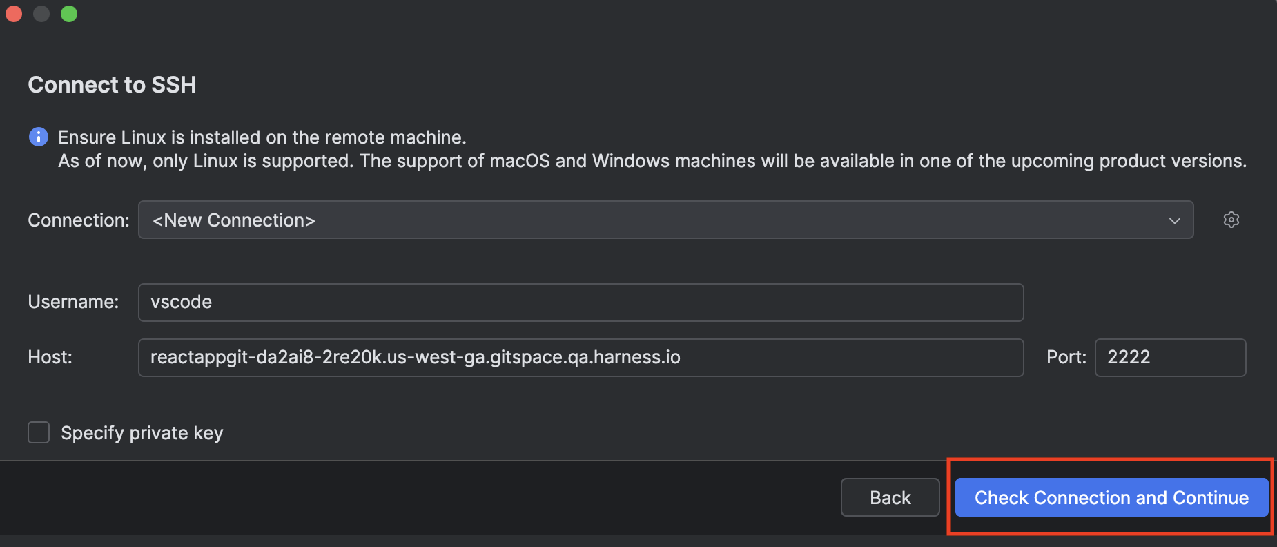 3. Add your SSH key and configure the required Gitspace specifications.