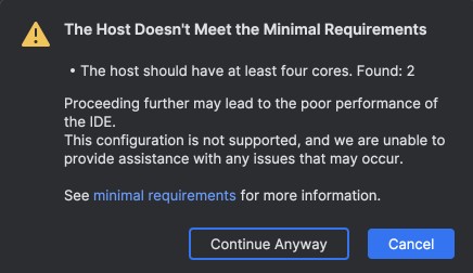 If your Gitspace does not meet the recommended requirements, the following warning may appear during your WebStorm setup. You can choose to create a new Gitspace that adheres to the recommended specifications or proceed with your existing configuration.
