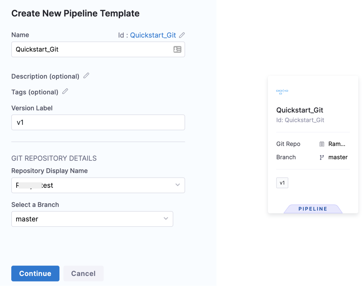 8. In Git Repository Details, in Repository Display Name, select your Git repository and Branch.