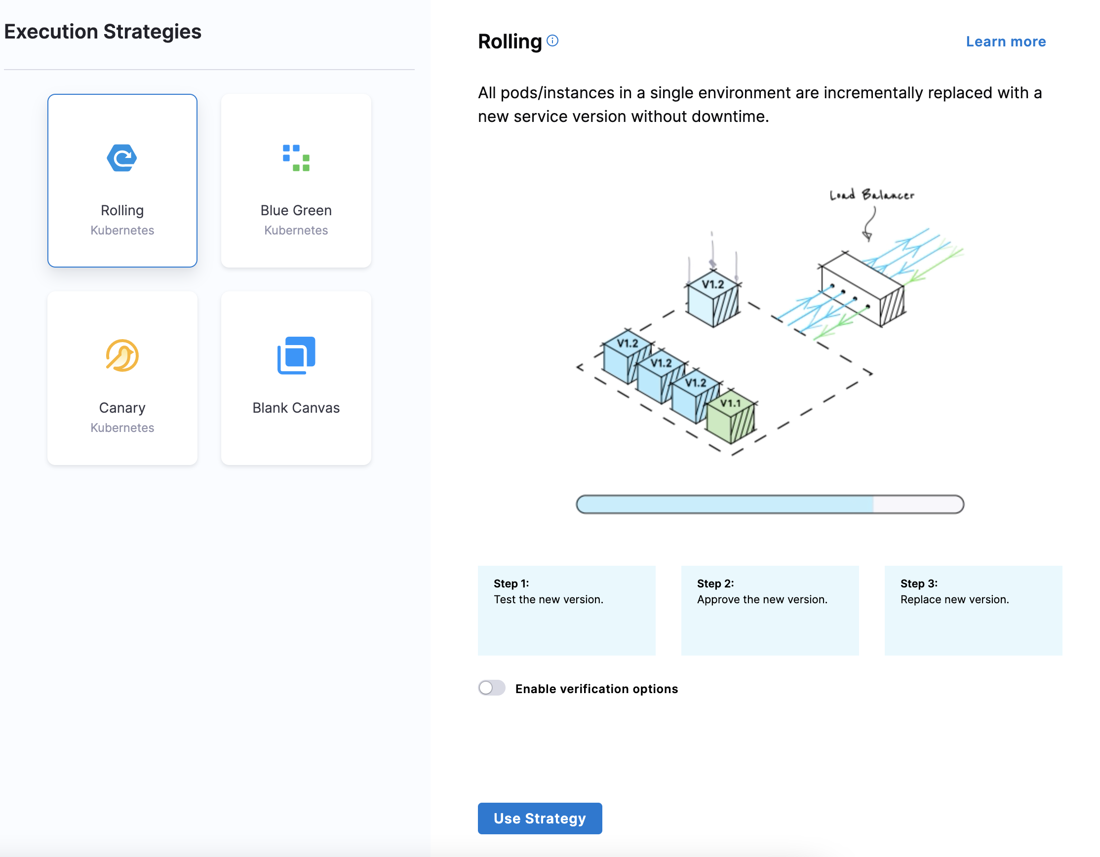 1. In Execution Strategies, select the deployment strategy for your pipeline template. We've used Rolling in this topic. For more information on different execution strategies, go to Deployment concepts and strategies.