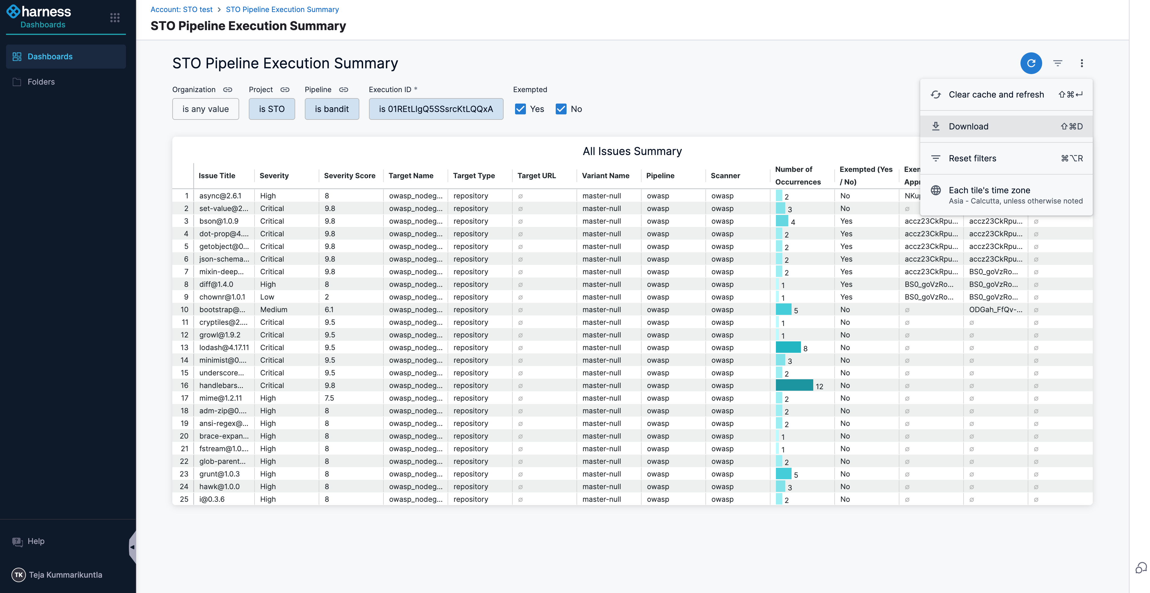 To export scan results from the Dashboard, you need to go to the Pipeline Execution Summary Dashboard. You can find the dashboard by navigating to the Dashboards section in your Harness account or you can also access the dashboard by clicking on the View in Dashboard option in the Vulnerabilities tab.