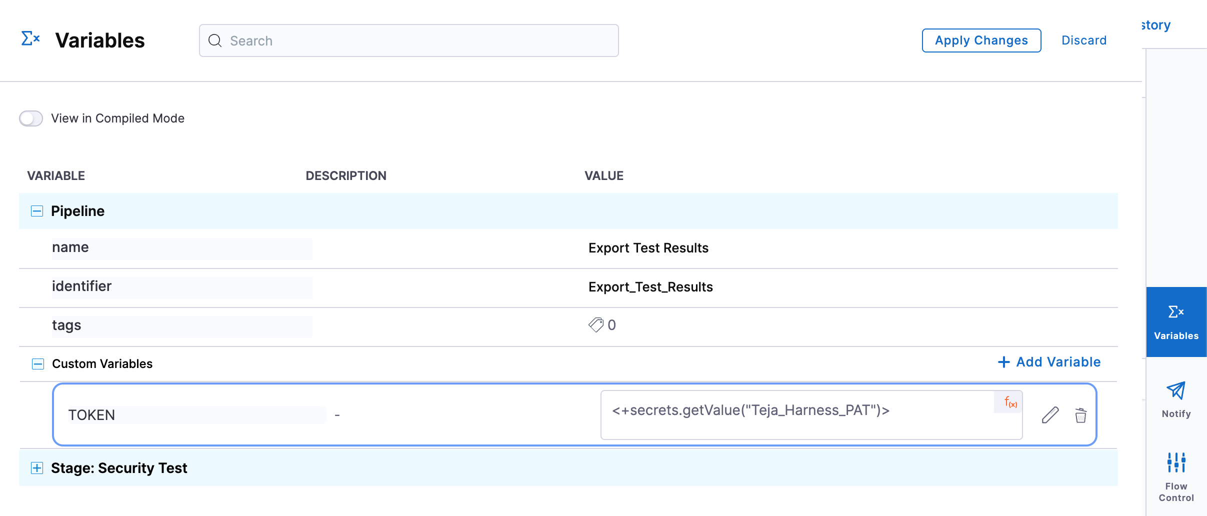 1. Create a pipeline variable named TOKEN and reference the stored Harness API key as a secret.
