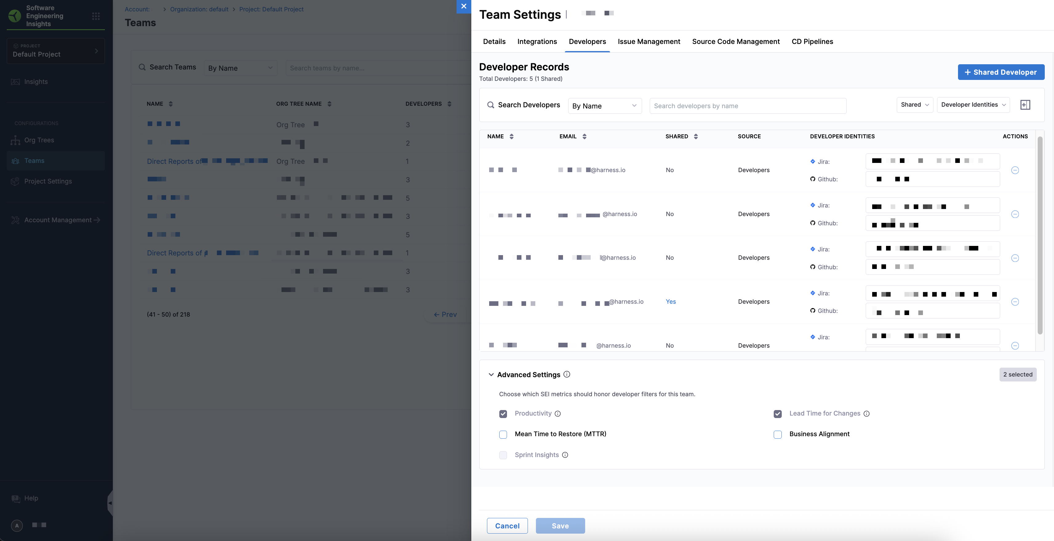 SEI 2.0 automatically links contributions to developer identities using Auto Identity Discovery, which matches email addresses and other identifiers to ensure accurate metric attribution. Ensure that the email addresses used in the Developers tab in Team Settings matches the emails your developers use across source systems. Incorrect or mismatched emails may result in missing or fragmented identity mappings in SEI 2.0.