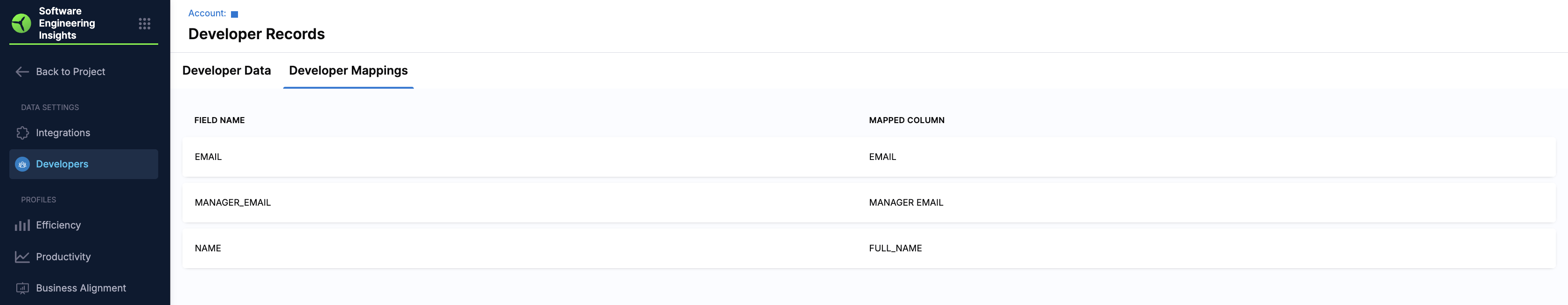 Accurate mappings are essential for ensuring developer records are correctly associated with roles, managers, and team assignments. To ensure that the fields from the uploaded CSV file are correctly mapped to Harness SEI's schema, navigate to the Developer Mappings tab in the Developers page
