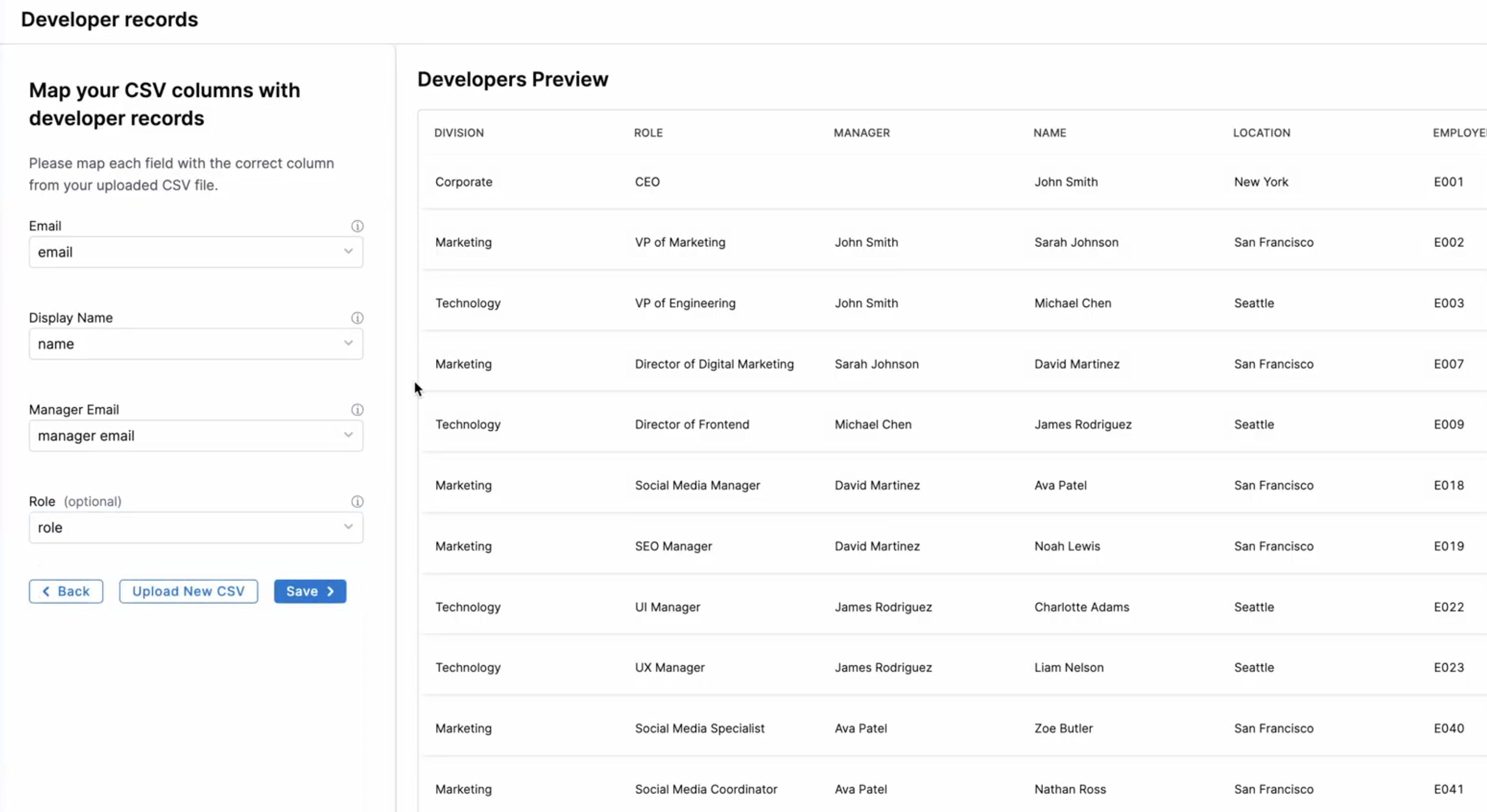 For automated or large-scale synchronization, you can manage developer records programmatically using the Developer CRUD APIs. These APIs allow you to sync developer data as part of your integration or HRIS sync workflow, ensuring your developer data remains up to date without manual uploads.